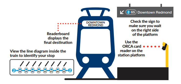 To pay the fare on the train, tap an ORCA card on the station platform fare payment readers before boarding the train. Fare Ambassadors will periodically check fare payment on platforms and trains. You can also use the Transit GO Ticket app to purchase a ticket and show the driver.